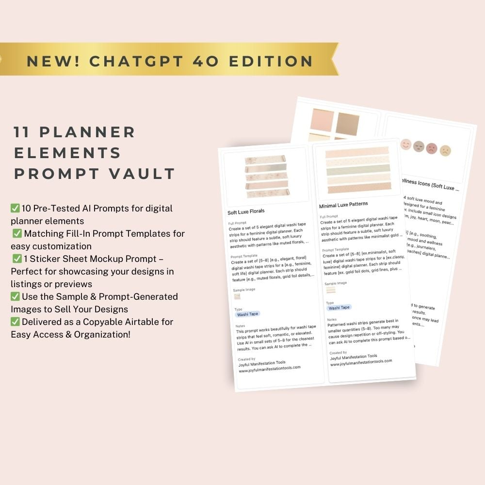 The Planner Element Prompts Vault is your personal collection of 11 high-quality AI prompts, crafted for creators who want to generate elevated digital planner stickers and elements using ChatGPT 4o image generator.